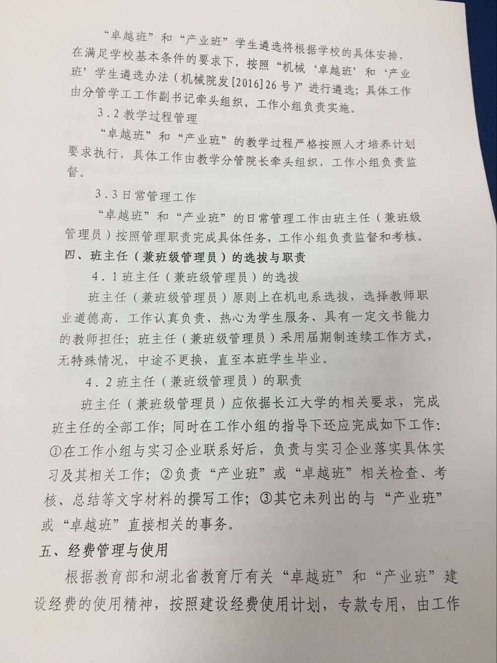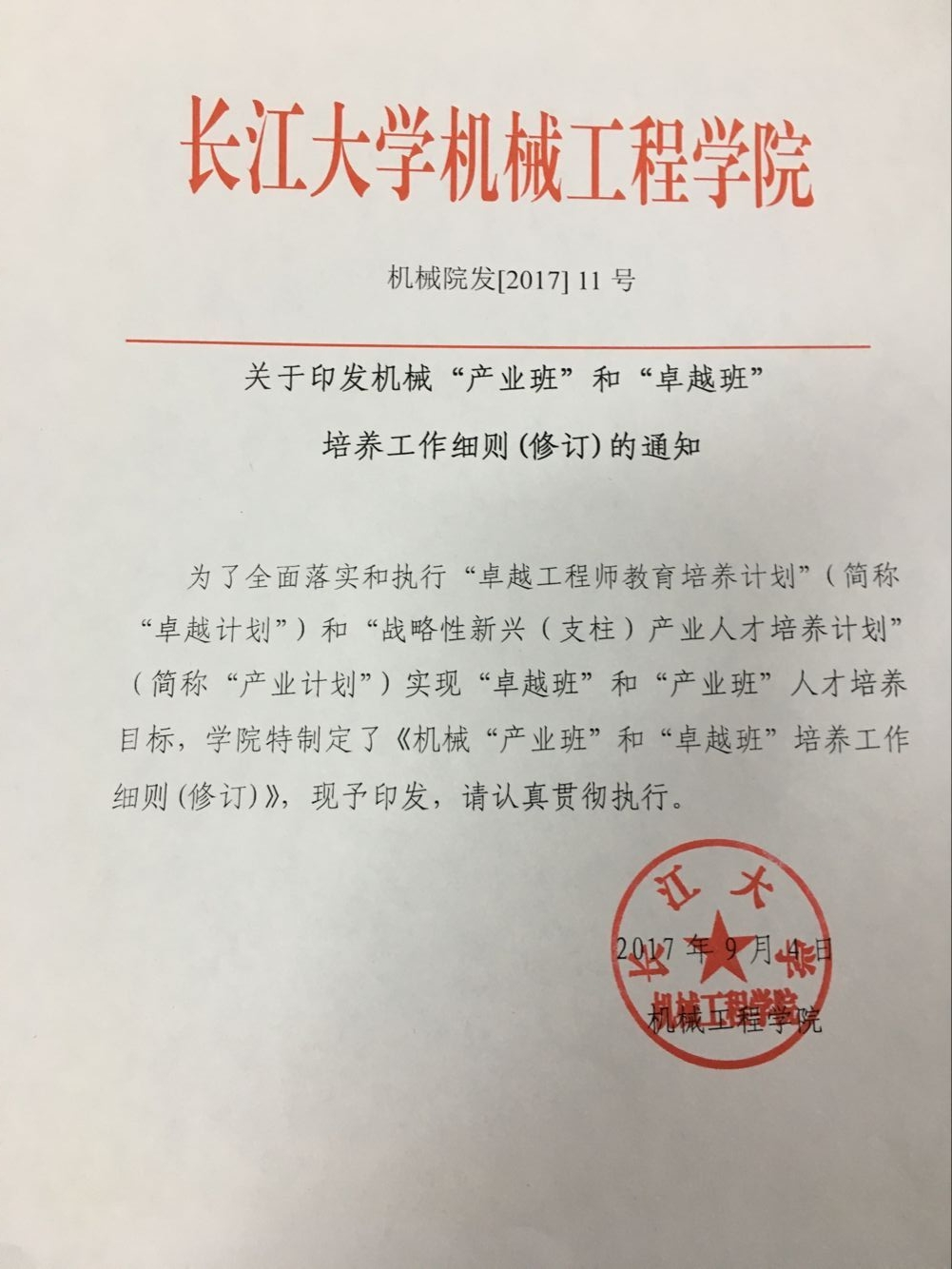 关于印发机械“产业班”和“卓越班”培养工作细则(修订)的通知