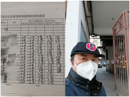 王新宇同志是公司最早下沉社区的党员之一。“2月9日,我在 ‘学习强国’平台上看到习近平总书记号召党员干部下沉社区的信息后,就想着要为社区做点事”,后来他及时到所居住的陶家巷社区报道,按照小区的安排,参与防疫工作。他每天值守四个多小时,挨个电话询问48户居民家庭的健康状况,为小区居民发放捐赠物资……小区居民多,疫情防控登记记录信息工作量大,他每天耐心地询问每户信息,仔细记录体温状况,不落一人。看似平凡的岗位,为社区防控疫情提供了第一手资料。“防护物资紧缺,第一天社区给发了一个N95口罩,我觉得很珍贵,戴了三天。”尽管所服务区域条件艰苦,没有大门,没有坐的地方,没有充足的防护物资,风里雨里,王新宇同志毅然每天坚守在社区防疫第一线,这份坚守的背后,是作为一名共产党员的不畏困难,勇于担当!
