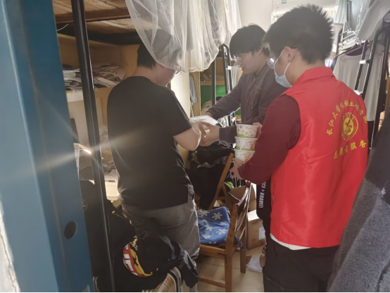 “发饭的时候真的手都在抖,但是当同学们接过饭的时候,一下就觉得很有意义。”“同学们都在群里喊饿,我们虽然也饿的没劲,但是就想快点把饭送到他们手上。”