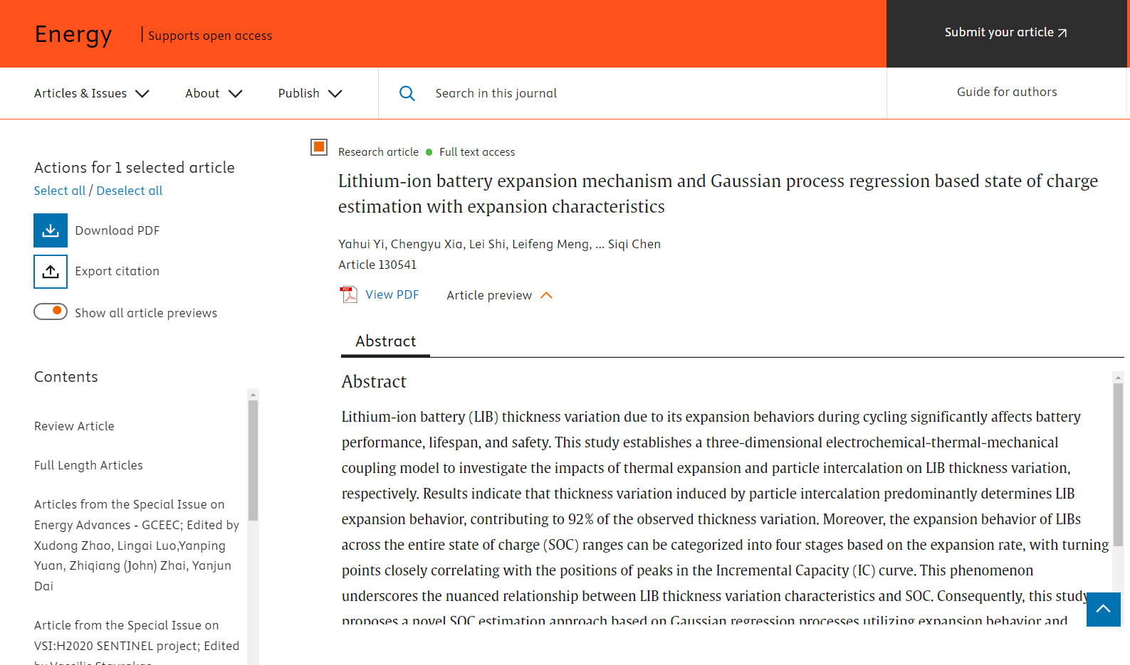 2024年1月31日,中科院一区top期刊《Energy》(《能源》,IF: 9.0)在线刊发了关于锂离子电池膨胀机理的最新研究成果。论文题目为:“Lithium-ion battery expansion mechanism and Gaussian process regression based state of charge estimation with expansion characteristics(锂离子电池膨胀机理和基于高斯过程回归的电荷估计状态)”。公司硕士研究生生伊亚辉、夏成宇教授为论文共同第一作者,钱利勤副教授为论文的通讯作者,304永利集团官网入口为论文第一完成单位。