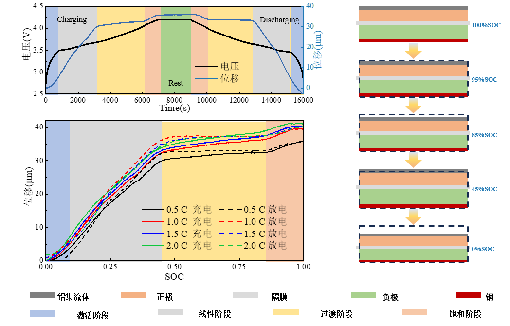 下图所示为锂离子电池的电化学膨胀行为。结果显示充电和放电过程中锂离子电池厚度分别增加和减少,且放电过程无法完全释放充电过程所引起的厚度增加。膨胀峰值随着电流大小的增加而增加,但膨胀趋势无明显变化。此外,依据膨胀特征的差异可以分为激活阶段、线性阶段、过渡阶段和饱和阶段。