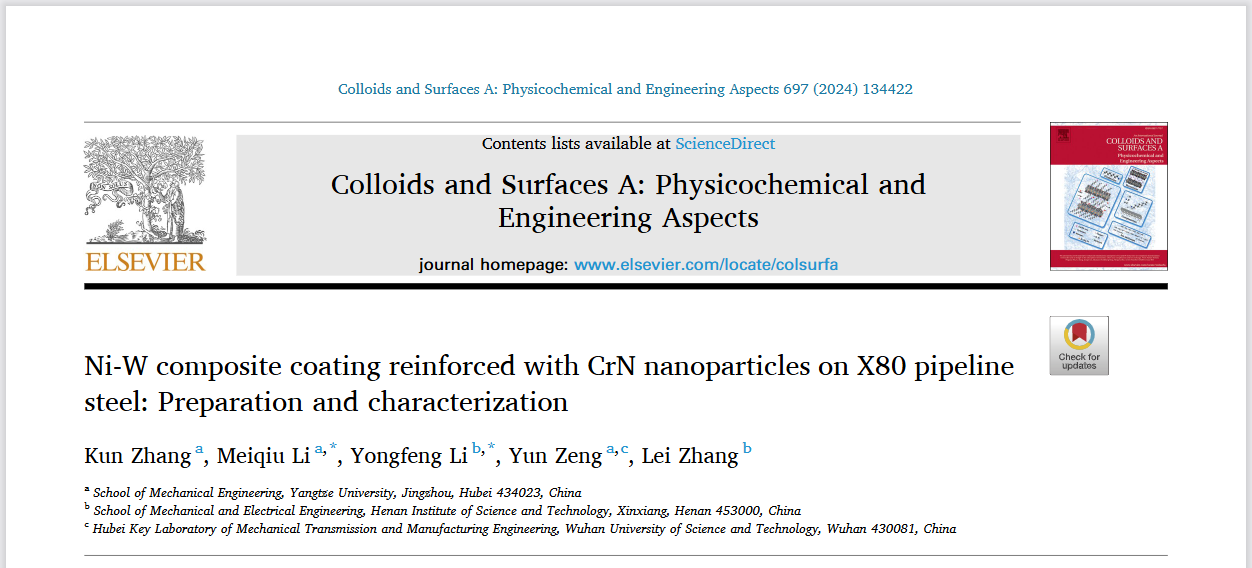 2024年6月,由Elsevier主办的权威外文T1级学术期刊Surface and Coatings Technology、T2级学术期刊Colloids and Surfaces A: Physicochemical and Engineering Aspects、T3级学术期刊Materials Today Communications先后刊发了公司李美求教授团队关于油气管道X80管线钢表面涂层的最新研究成果,公司博士研究生张昆为论文第一作者,李美求教授为论文的通讯作者。