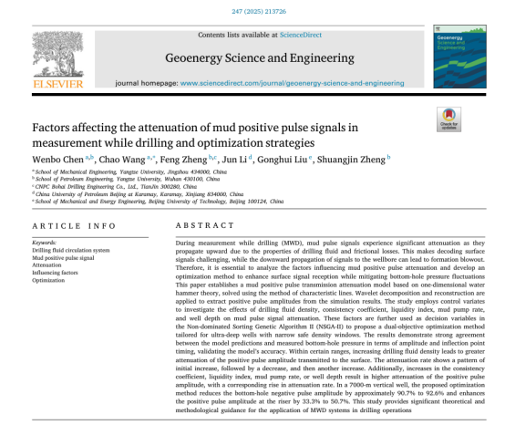 (通讯员 王俊)公司硕士陈文博在《Geoenergy Science and Engineering》发表关于随钻测量(MWD)工具应用安全的最新研究成果“Factors affecting the attenuation of mud positive pulse signals in measurement while drilling and optimization strategies”,由304永利集团王超副教授和石油工程公司郑双进教授联合指导。