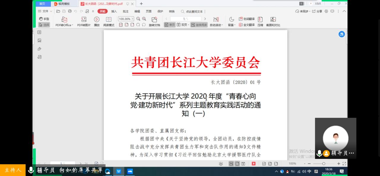 为了做好“青春战‘疫’,一展芳华”三月主题团会,向如老师详细介绍了本次团会的目的和会议主要内容,对落实团会工作提出具体要求。他提醒各班严格按照校团委的文件精神组织召开班团会,认真学习并开展讨论,树立优秀典型,及时上报团会学习总结材料。同时,向如老师还与大家观看视频,共同学习《习近平回信勉励北京大学援鄂医疗队全体“90”后党员:让青春在党和人民最需要的地方绽放炫丽之花》这一动人事迹。