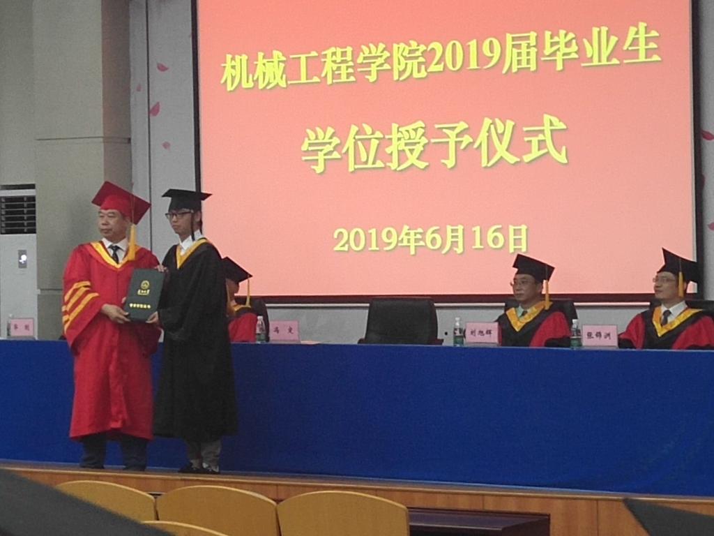 讲话结束后,经理冯定教授为毕业生授予学位。2019届毕业生获得304永利集团官网入口工学博士、硕士、学士学位的同学依次上台接受学位证书。在神圣庄严的气氛中,毕业生们身着学士袍,登上受礼台,经理一一与同学们亲切握手,并将学位流苏从右边拨至左边象征着已授予学位,员工从经理手中接过学位证书并合影留念。最后全院同学全体起立合影,仪式圆满结束。