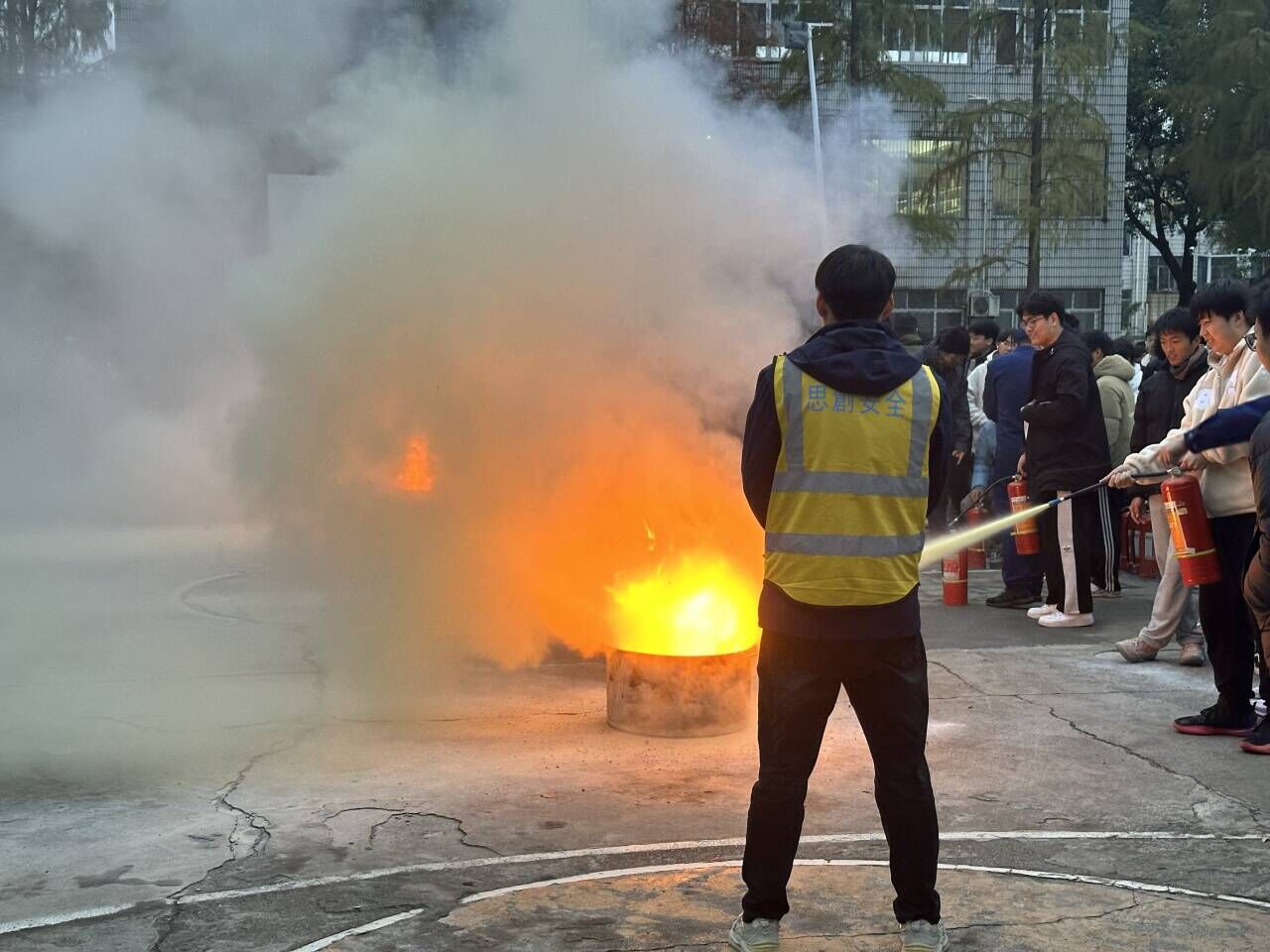 最后在室外进行了消防安全演练,部分同学也亲自体验了操作干粉灭火器并成功灭火。
