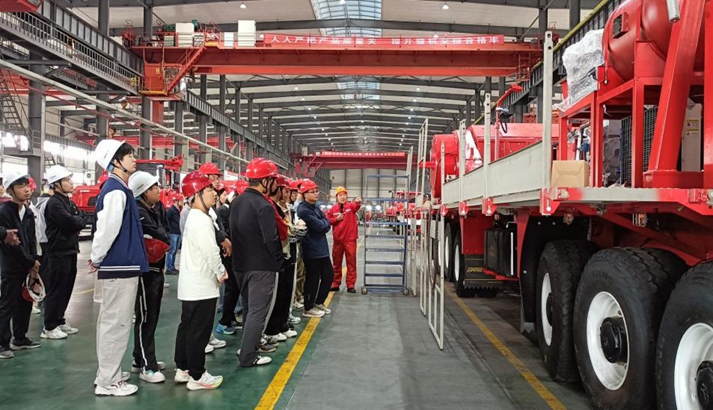 随后,师生队伍深入生产一线,实地走访主要生产车间。同学们现场观摩了大型油气装备如固井压裂设备、修井机等关键产品的制造、组装与检测流程。现代化的厂房、精密的加工设备、严谨的工艺控制以及工人娴熟的操作,让大家对石油机械的复杂结构、高技术要求及严格的质量管理体系有了更为具体和深刻的认识。企业技术专家随行讲解关键设备的技术原理、生产工艺及市场应用,并耐心解答同学们的提问。